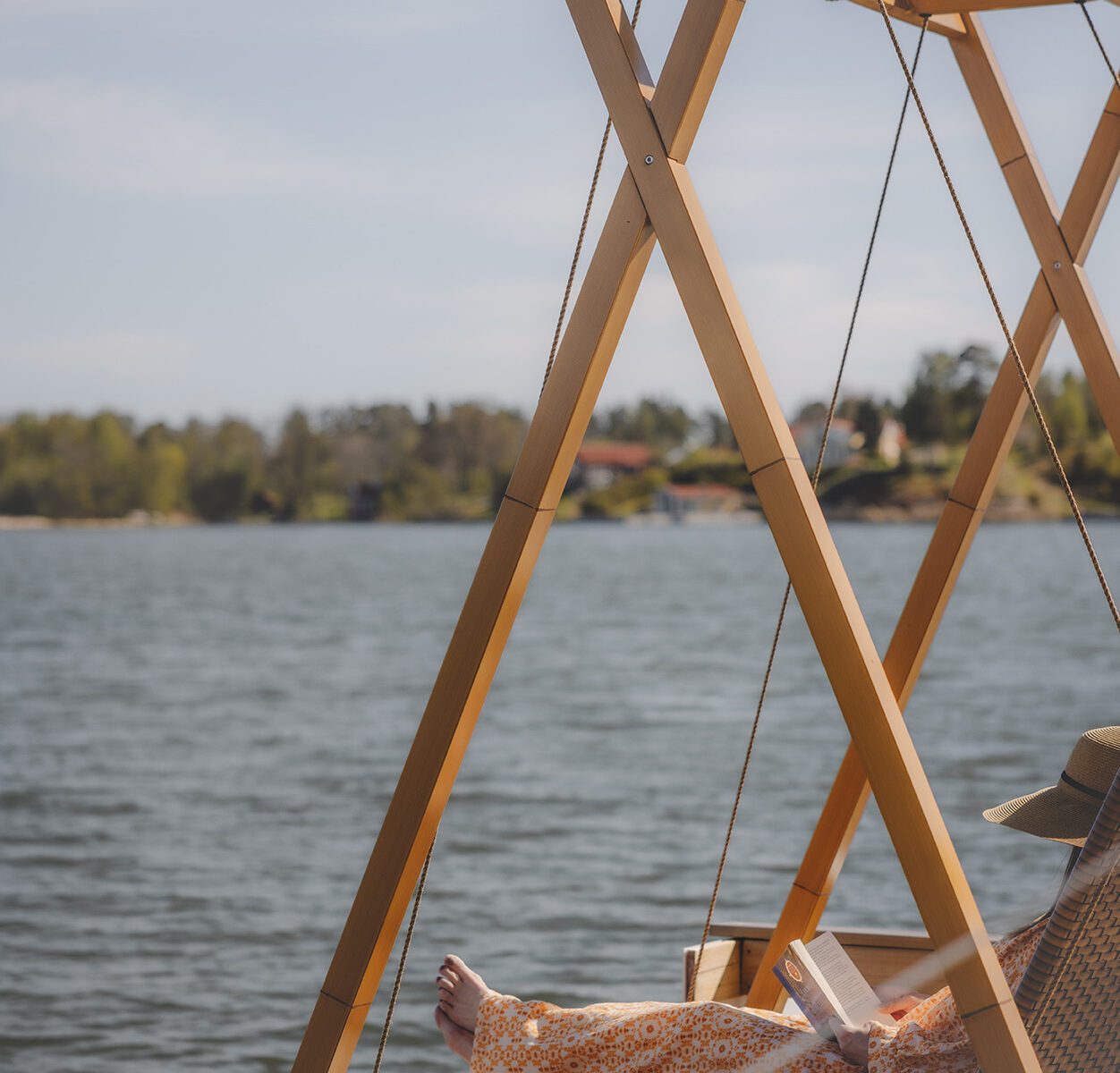 Du väljer om du vill bo fast förankrad under trädkronorna på ön Rackarens högsta punkt, eller vaggas till sömns av vågornas rörelser på en förtöjd glampingflotte. Frukostkorgen levereras till tältet.